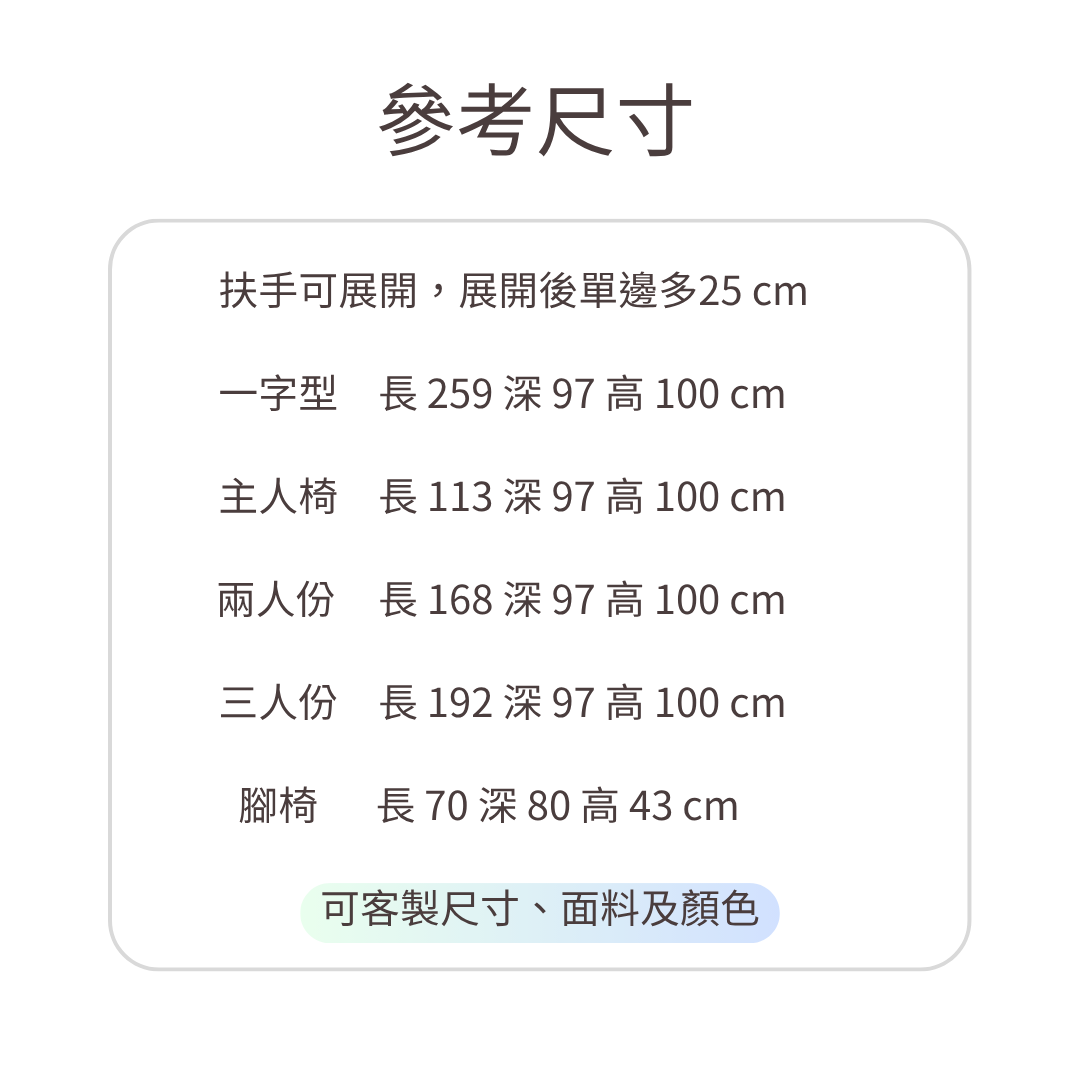 主人椅:總長113cm~163cm 標準2人型:總長168cm~218cm 標準3人型:總長192cm~242cm 一字型:總長259cm~309cm 尺寸 不提供 尺寸 一字型, 標準3人型, 標準2人型, 主人型 商品評價 目前沒有評價。 搶先評價 “阿波羅 Apollo”取消回覆發佈留言必須填寫的電子郵件地址不會公開。 必填欄位標示為 *您的評分 * 評分… 完美 很好 一般 不錯 很差 名稱 *電子郵件 *您的評價 * 在瀏覽器中儲存顯示名稱、電子郵件地址及個人網站網址,以供下次發佈留言時使用。 送出