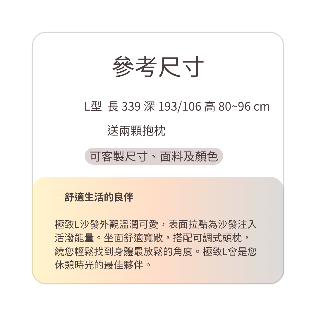 【商品特色】 這款設計精良的沙發擁有可調節的頭枕,讓您隨心調整支撐力度,享受極致舒適。獨特的L型設計節省空間,同時提升家居風格與生活品味。選擇極致L型頭枕可調整沙發,讓每一刻都充滿豪華與舒適! 可訂製 請來電或LINE諮詢 總寬 339cm 總深 106/193cm 坐寬 235/67/104cm 坐高 38cm 高 80(96)cm 商品評價 目前沒有評價。 搶先評價 “極致L Leading L”取消回覆發佈留言必須填寫的電子郵件地址不會公開。 必填欄位標示為 *您的評分 * 評分… 完美 很好 一般 不錯 很差 名稱 *電子郵件 *您的評價 * 在瀏覽器中儲存顯示名稱、電子郵件地址及個人網站網址,以供下次發佈留言時使用。 送出